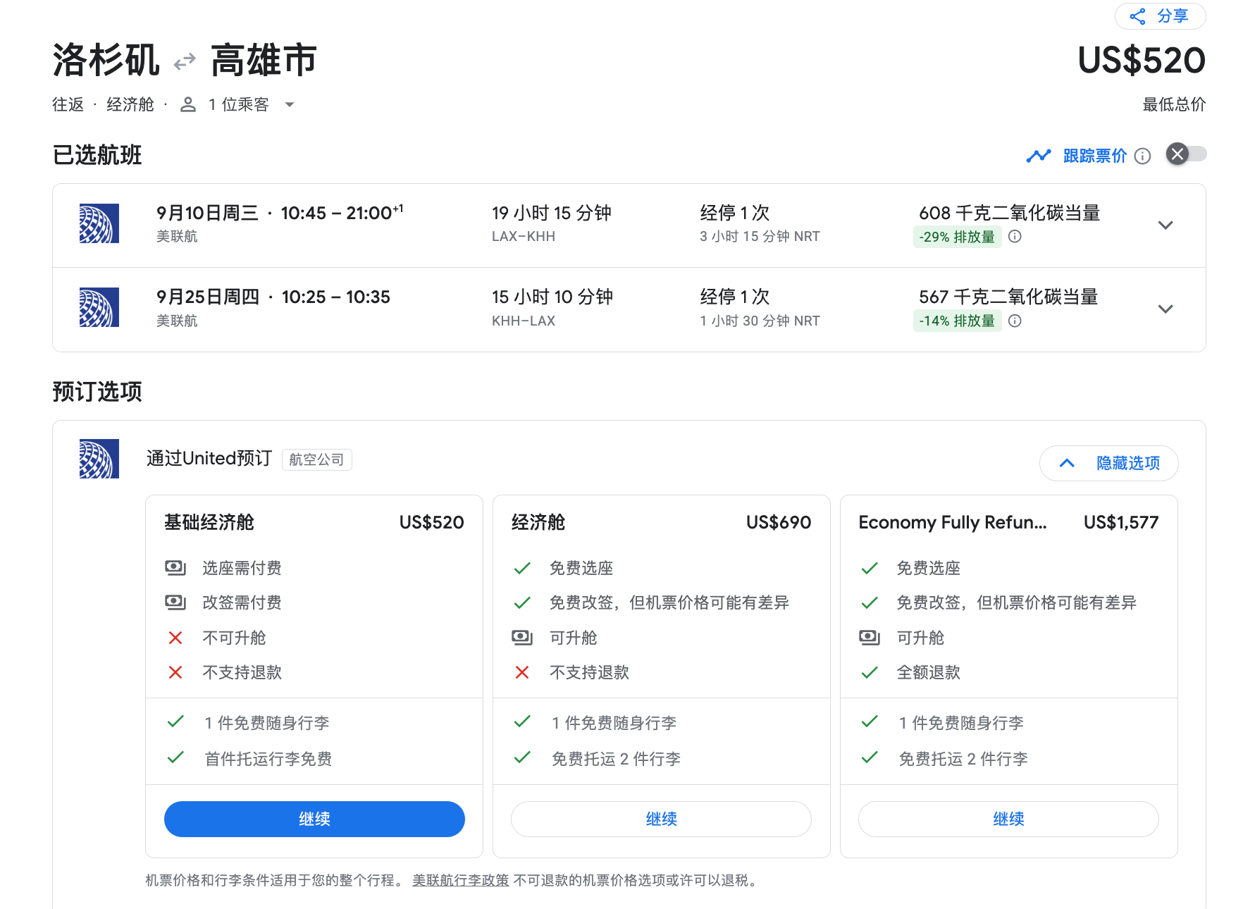 9月洛杉矶出发,往返高雄520美金