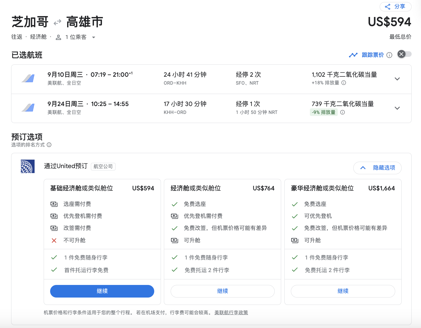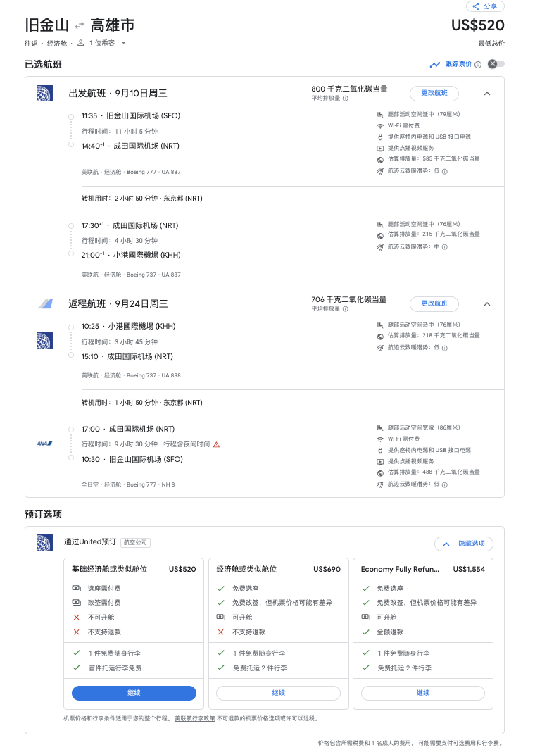 东京成田NRT – 高雄KHH【美联航】