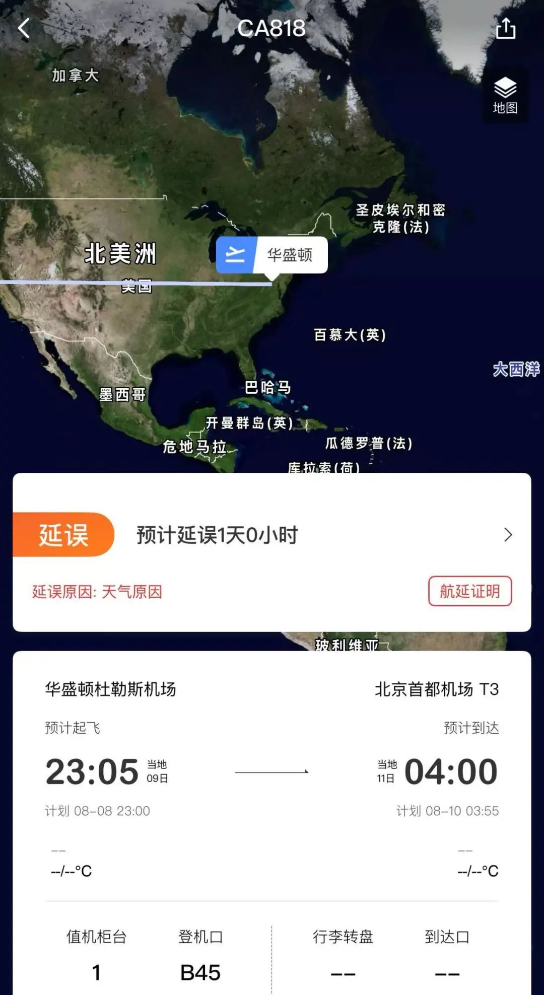 1)原本8月8日出发的中国国际航空公司北京-华盛顿DC CA817/CA818、纽约JFK-北京CA982航班,因此推迟一天起飞