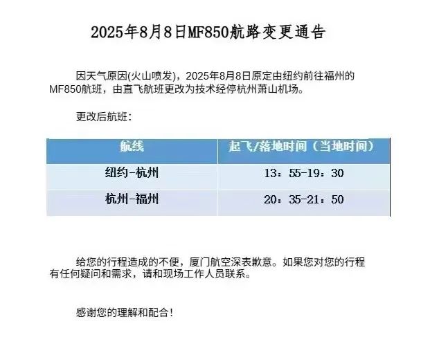 2)8月8日厦门航空的MF850 纽约JFK-福州航班将在杭州技术经停(乘客不下飞机)