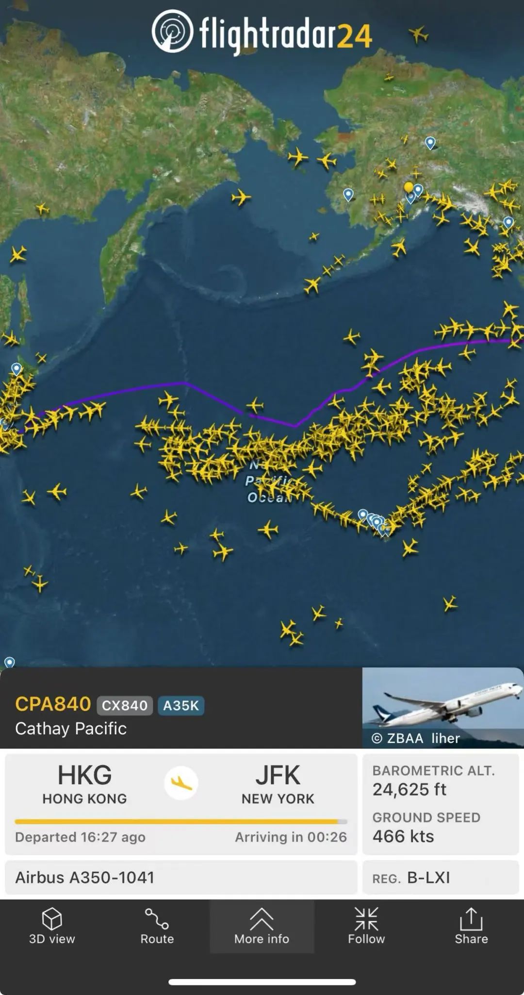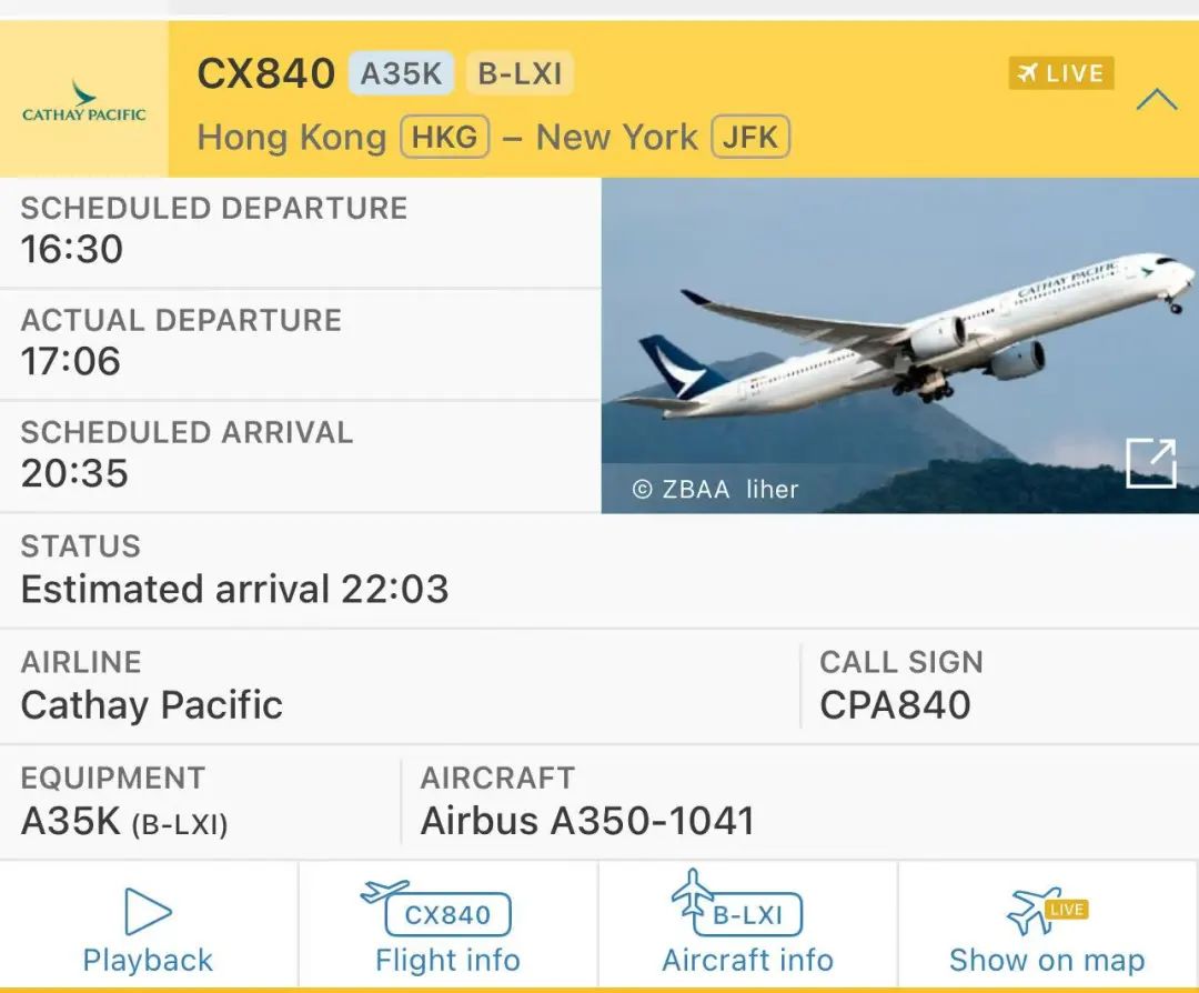 谁都不会想到国泰从香港飞纽约(东海岸),还能在太平洋上打个勾呢(延误接近90分钟)