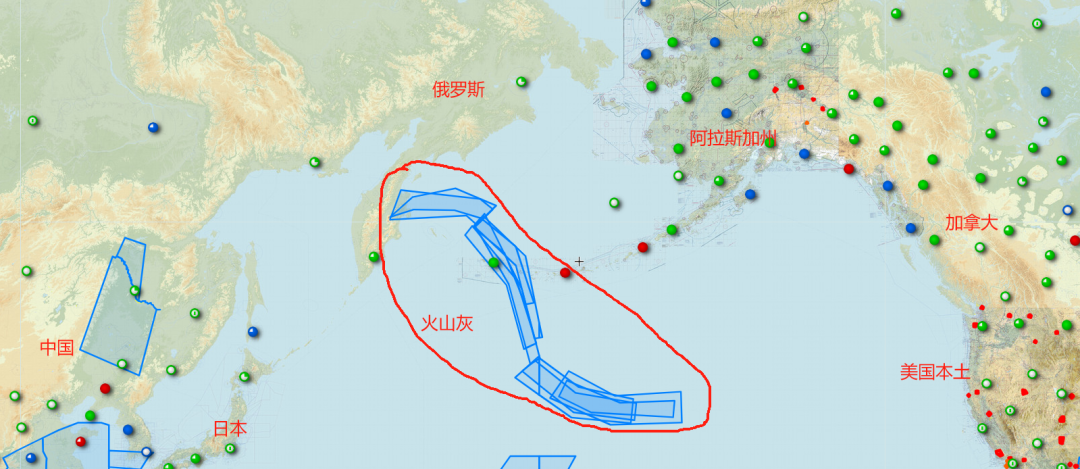 根据skyvector网站,我们大概画了这么一个示意图,蓝色框是当下的NOTAM,高度从海平面到35000英尺或40000英尺不等(涵盖了民航客机常用的巡航高度)。从图中大家可以明显看到火山灰飘在太平洋上,成为了中美航路之间的阻碍。