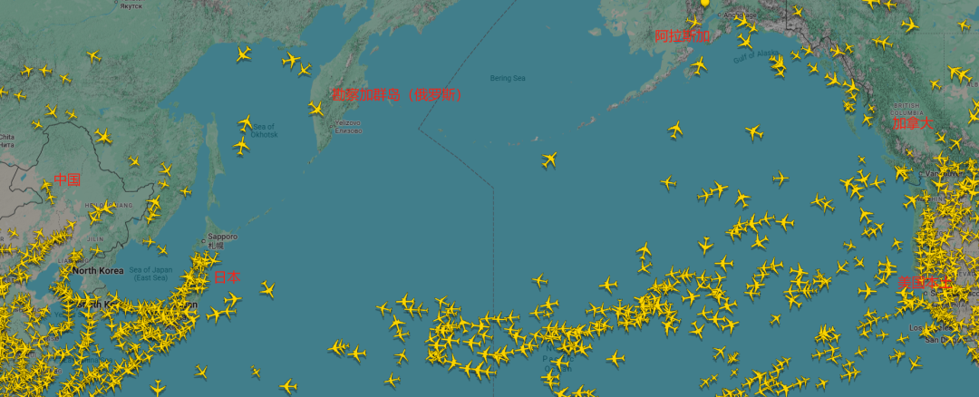 从flightradar 24的飞机实时航图上,也很明显看到太平洋上有一个大“空白”。
